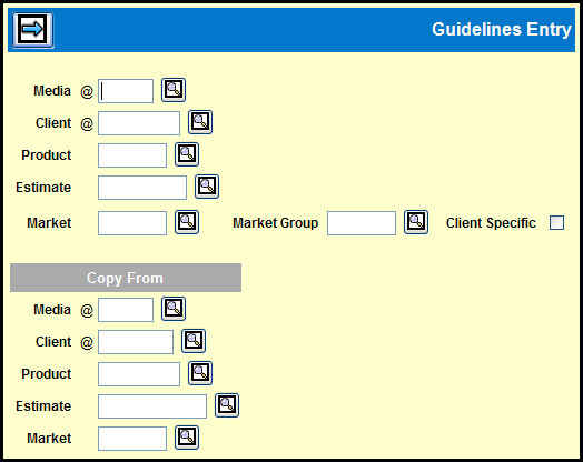 If you want to copy guidelines that you have previously defined for another Client, Product, Estimate, or Market to the one that you are currently working on, just fill in the appropriate codes in the fields in the Copy From section.